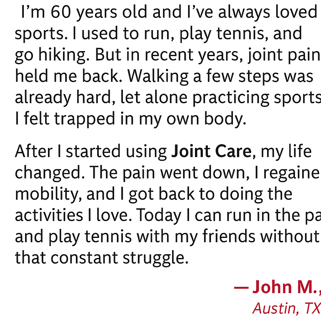 Users consistently described Joint Care as the only product that truly made a lasting difference.
